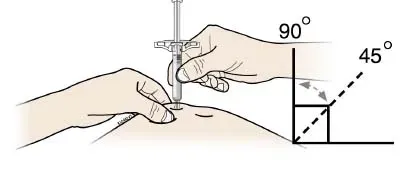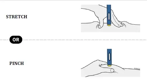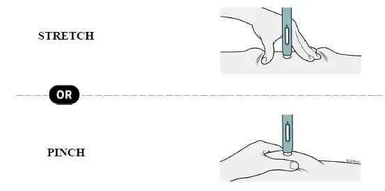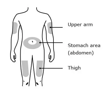 - Vstřikněte do přední části stehna nebo žaludku (s výjimkou 2 palců kolem tlačítka břicha).