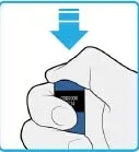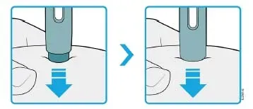 4D Pokračujte v tlačení autoinjektoru dolů a stisknutím tlačítka Purple Start spusťte injekci.