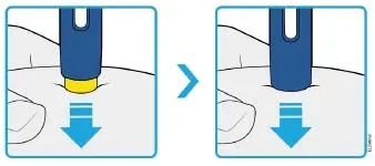 4e Pokračujte v tlačení autoinjektoru dolů. Když je okno plně žluté, injekce je dokončena.
