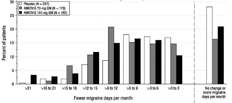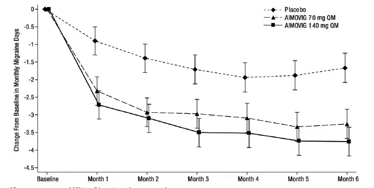 V placebem kontrolovaných klinických studiích (studie 1 2 a 3) z 2184 pacientů 787 pacientů dostávalo alespoň jednu dávku Aimovigu 70 mg, kdykoli měsíčně 507 pacientů dostalo alespoň jednu dávku Aimovigu 140 mg jednou měsíčně a 890 pacientů dostávalo placebo během 3 měsíců nebo 6 měsíců léčby dvojitě spuštěnou [ Klinické studie ]. Přibližně 84% bylo žen 91% bílých a průměrný věk byl 42 let při vstupu do studie.