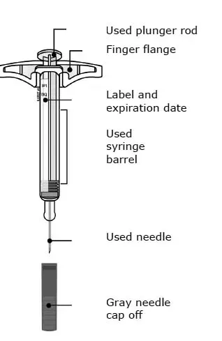 5A Umístěte použitý autoinjektor a oranžový uzávěr do nádoby na likvidaci Sharps Cleared FDA hned po použití.