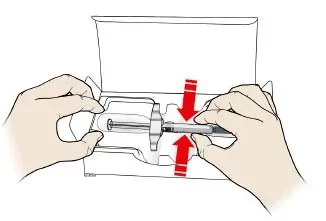 4a Uchopte autoinjektorem, takže můžete vidět okno. Vytáhněte bílou čepici přímo. Možná budete muset tvrdě vytáhnout.