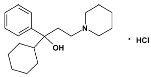 Artane (Trihexyphenidyl HCl) je substituovaná piperidinová sůl 3- (1-piperidyl) -1-fenyl-cyklohexyl-1-propanol hydrochlorid, který má přímý inhibiční účinek na parasymmpatický nervový systém. Má také relaxační účinek na hladkou musculaturu; vyvíjel jak přímo na samotnou svalovou tkáň, tak nepřímo prostřednictvím inhibičního účinku na parasympatický nervový systém. Její terapeutické vlastnosti jsou podobné vlastnostem atropinu, i když nežádoucí vedlejší účinky jsou obvykle méně časté a závažné než u nich.