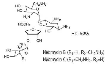 Neomycin sulfát je sulfátová sůl neomycinu B a C, které jsou produkovány růstem Streptomyces Fradiae Waksman (fam. Streptomyceceaeae). Má účinný ekvivalent nejméně 600 ug standardu neomycinu na mg vypočtený bezvodým základem. Strukturální vzorce jsou: