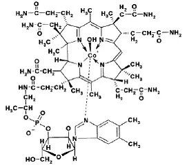 Hydroxocobalamin Účinnou složkou v Cyanokitu je kobinamid dihydroxid dihydrogen fosfát (ester) mono (vnitřní sůl) 3'-ester s 56-dimethyl-1-a-d-ribofuranosyl-1H-benzimidazolem. Lékařská látka je hydroxylovaná aktivní forma vitaminu B12 a je velká molekula, ve které je trivalentní kobaltový ion koordinován na čtyřech pozicích tetrapyrolem (nebo koordinovým) kroužkem. Je to hygroskopický tmavě červený krystalický prášek bez zápachu, který je volně rozpustný ve vodě a ethanolu a prakticky nerozpustný v acetonu a diethyletheru. Hydroxocobalamin má molekulovou hmotnost 1346,36 atomové hmoty jednotky Empirický vzorec C 62 H 89 S 13 O 15 P a následující strukturální vzorec: