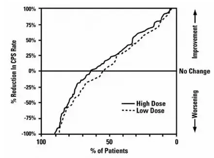 Obrázek 2 představuje podíl pacientů (osy x), jejichž procentuální snížení z výchozí hodnoty ve složité míře částečných záchvatů bylo přinejmenším tak velké, jak je uvedeno na ose Y ve studii doplňkové terapie. Pozitivní procentuální snížení naznačuje zlepšení (tj. Snížení frekvence záchvatů), zatímco negativní snížení procenta naznačuje zhoršení. V zobrazení tohoto typu se tedy křivka pro efektivní ošetření posune doleva od křivky pro placebo. Tento obrázek ukazuje, že podíl pacientů, kteří dosáhli jakékoli konkrétní úrovně zlepšení, byl u valproátu trvale vyšší než u placeba. Například 45% pacientů léčených valproátem mělo ≥ 50% snížení komplexní míry částečného záchvatů ve srovnání s 23% pacientů léčených placebem.