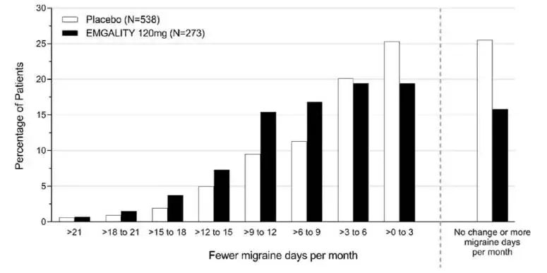 V placebem kontrolovaných klinických studiích (studie 1 2 a 3) 705 pacientů dostalo alespoň jednu dávku Emgality 120 mg jednou měsíčně a 1451 pacientů dostávalo placebo během 3 měsíců nebo 6 měsíců dvojitě zaslepené léčby [viz viz dvojitě slepá léčba [viz viz Klinické studie ]. Z pacientů léčených emgalitou přibližně 85% byly ženy 77% bílé a průměrný věk byl 41 let při vstupu do studie.