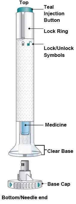 A. Po stisknutí tlačítka injekce šedozelená injekce uslyšíte 2 hlasitá kliknutí. Druhé kliknutí vám řekne, že vaše injekce je kompletní. Uvidíte také šedý píst v horní části čiré základny.