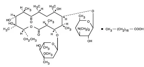 Erytromycin je produkován kmenem Saccharopolyspora erythraea (dříve Streptomyces erythraeus ) a patří do makrolidové skupiny antibiotik. Je to základní a snadno tvoří soli s kyselinami. 37 H 67 ŽÁDNÝ 13 • C. 18 H 36 O 2 a molekulová hmotnost je 1018,43. Strukturální vzorec je: