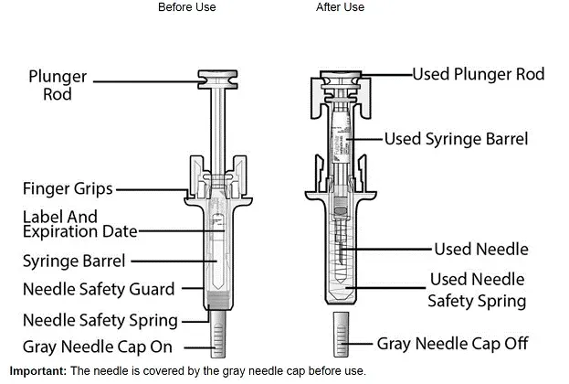 - Po použití vložte použitý předplněnou stříkačku do kontejneru likvidace Sharps Clared FDA. Ne Vyhoďte stříkačku do koše pro domácnost.