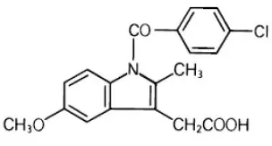 Indocin (indomethacin) perorální suspenze je nesteroidní protizánětlivý lék dostupný jako perorální suspenze obsahuje 25 mg indomethacinu na 5 ml alkoholu 1% a kyselinu sorbovou 0,1% přidanou jako konzervační látka pro perorální podání. Chemický název je-(4-chlorbenzoyl) -5-methoxy-2-methyl-1 H Kyselina indol-3-octová. Molekulová hmotnost je 357,8. Jeho molekulární vzorec je C 19 H 16 Clo 4 a it has the following chemical structure.