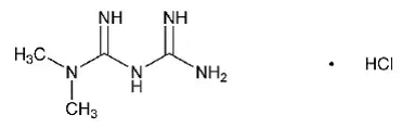 Hydrochlorid metforminu (NN-dimethythylimidodikarbonimidický hydrochlorid diamid) není chemicky nebo farmakologicky spojený s jinými třídami perorálních antihyperglykemických látek. Hydrochlorid metforminu je bílá až bílá krystalická sloučenina s molekulárním vzorcem C 4 H 11 N 5 • HCI a molekulová hmotnost 165,63 g/mol. Metformin hydrochlorid je volně rozpustný ve vodě a je prakticky nerozpustný v acetonu etheru a chloroformu. PKA metforminu je 12,4. PH 1% vodného roztoku hydrochloridu metforminu je 6,68. Strukturální vzorec je:
