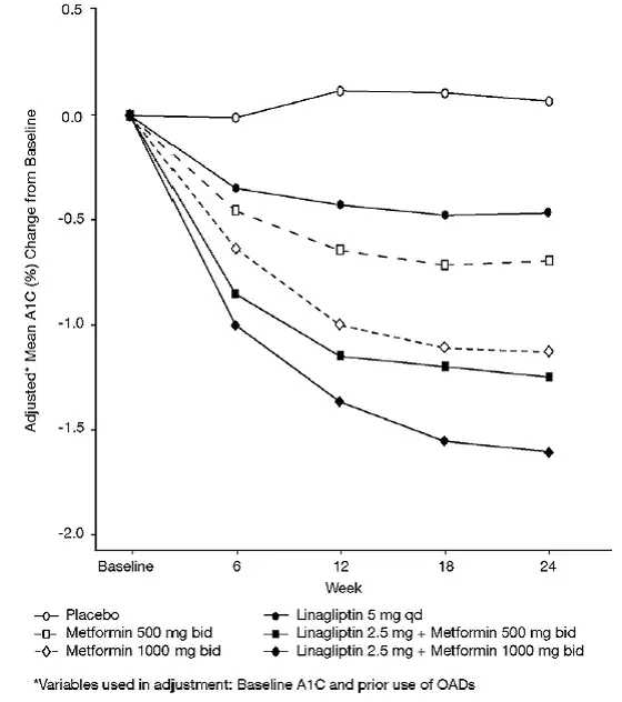 - U pacientů, kteří již byli léčeni metforminem HCI, začínají s 2,5 mg linagliptinem a současnou dávkování metforminu HCl odebrané při každém ze dvou denních jídel (např. Pacienta o metforminu HCl 1000 mg dvakrát denně by byla zahájena na 2,5 mg linagliptinu/1000 mg metforminu HCl dvakrát denně s jídlem).