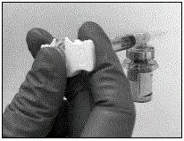 Vyjměte tlačítko odvrácení z horní části lahvičky a odhalujete gumovou zátku. Umístěte lahvičku do stojaté polohy na připraveném povrchu. Dezinfikujte gumovou zátku s otěrnou alkoholem. Zlikvidujte otírání alkoholu a nechte zátku vyschnout. Vložte zadní část do příruby injekční stříkačky, dokud nebudete cítit, jak ji zachovává na místě. Pokračujte v míchání aktivace.