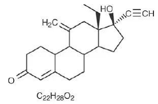 Etonogestrel [13-ethyl-17-hydroxy-11-methylen-1819-dinor-17a-pregn-4-en-y-y-3-one] strukturálně odvozený z 19-Nortestosteronu je syntetický biologicky aktivní metabolit syntetického progestin desogestru. Má molekulovou hmotnost 324,46 a následující strukturální vzorec (obrázek 19).