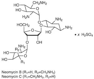 Neomycin sulfát je sulfátová sůl neomycinu B a C, které jsou produkovány růstem Streptomyces Fradiae Waksman (fam. Streptomyceceaeae). Má účinný ekvivalent nejméně 600 mcg standardu neomycinu na mg vypočtený bezvodým základem. Strukturální vzorce jsou: