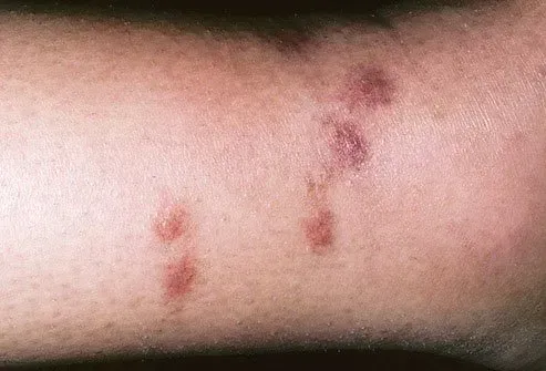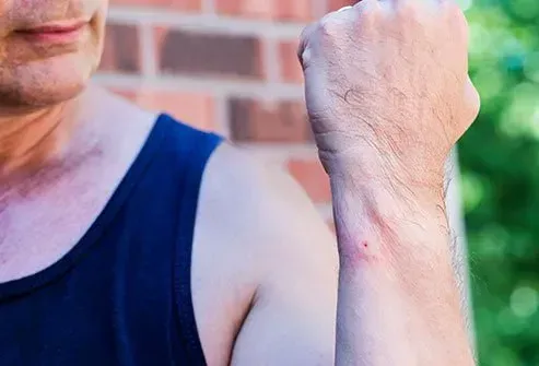 - Další chyby a členovci. Klíšťové blechy a roztoči mohou způsobit bolestivé reakce kůže včetně Lymeovy choroby a skalnaté horské horečky. Lymeova choroba může způsobit vzorec bullseye kolem kousnutí podobného tomu, co je vidět po některých kousnutí pavouka.