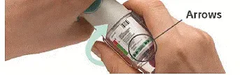 - Zatímco se pomalu zhluboka nadechněte ústy, stiskněte tlačítko uvolňování dávky a nadále dýchejte.