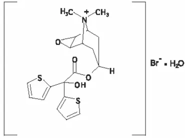 Tiotropium bromid (monohydrát) má molekulární hmotnost 490.4 a molekulární vzorec C19H22NO4S2BR • H2O.