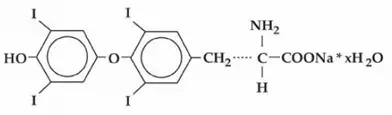 Synthroid (tablety sodíku levothyroxinu USP) obsahují syntetický krystalický L-33'55'- tetraiodothyroninová sodná sůl [levothyroxin (T 4 ) sodík]. Syntetická t 4 je totožný s tím, že se produkovala v lidské štítné žláze. Levothyroxin (t 4 ) sodík má empirický vzorec c 15 H 10 I 4 N ne 4 • h 2 O Molekulová hmotnost 798,86 g/mol (bezvodý) a strukturální vzorec, jak je znázorněno: