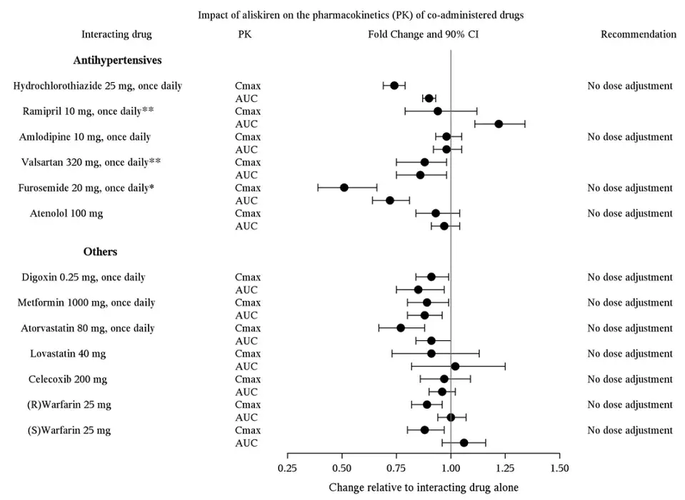 Aliskiren 150 mg a 300 mg a valsartan 160 mg a 320 mg byly studovány samostatně a v kombinaci v 8-týdenní randomizované dvojitě slepé studii dávkované dávky s eskalací paralelní skupiny. Dávky Aliskirenu a Valsartanu byly zahájeny při 150 mg a 160 mg a zvýšily se po 4 týdnech na 300 mg a 320 mg. Krevní tlak na sedící koryta byla měřena na začátku 4 a 8 týdnů. Snížení krevního tlaku s kombinací bylo větší než snížení s monoterapií, jak je uvedeno v tabulce 4. Obecně by se měla vyhnout kombinaci blokátoru receptoru Aliskiren a Angiotensin [Viz viz Kontraindikace VAROVÁNÍS AND OPATŘENÍ a Lékové interakce ].