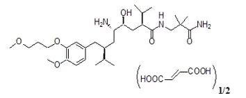 Hemifumarát Aliskiren je bílý až lehce nažloutlý krystalický prášek s molekulovou hmotností 609,8 (volná báze551.8). Je rozpustný ve fosfátovém pufru N-Octanol a vysoce rozpustný ve vodě.