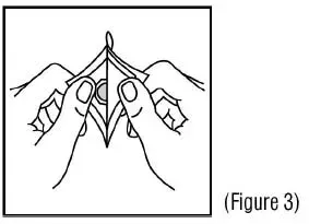 5. Naneste kovový lepicí povrch transdermu Scöp pevně do suché oblasti kůže za uchem. Potiskovaná opálená barevná strana transdermálního systému by měla čelit a zobrazovat (viz Obrázek 5 ). After placement of Transderm Scöp avoid touching or applying pressure to the transdermal system while it is being worn because applying pressure may cause scopolamine to ooze out at the edge. Wash your has with soap a water right away after applying Transderm Scöp so that any medicine from Transderm Scöp that gets on your has will not get into your eyes.