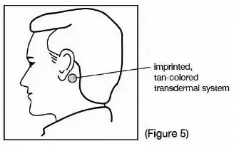 - Pokud se transdermální systém stane přemístěním transdermálního systému a aplikuje nový transdermální systém na bezsrstý oblast za druhým uchem.