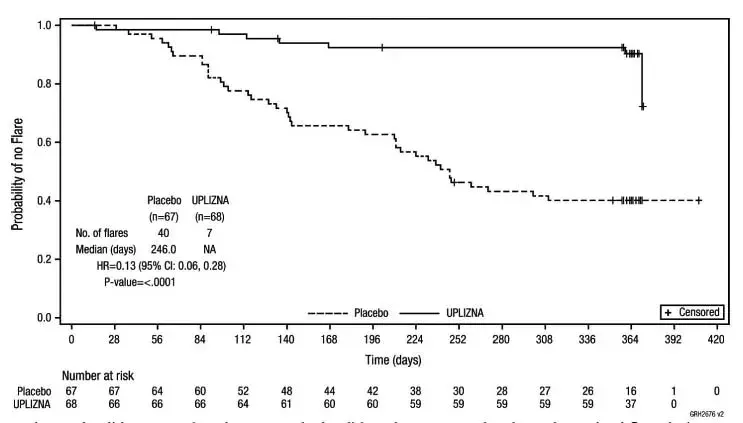 Koncovým bodem primární účinnosti byl čas na poprvé léčené a rozhodné komise (AC)-určené vzplanutí IgG4-RD během 52týdenního RCP. Čas k prvnímu ošetřenému a AC určenému vzplanutí IgG4-RD byl ve skupině uplizna výrazně delší ve srovnání se skupinou placeba (obrázek 2). Uplizna snížila riziko léčeného a AC určeného IgG4-RD vzplanutí o 87% ve srovnání s placebem (poměr rizika: 0,13; P; P <0.0001) (see Table 6).