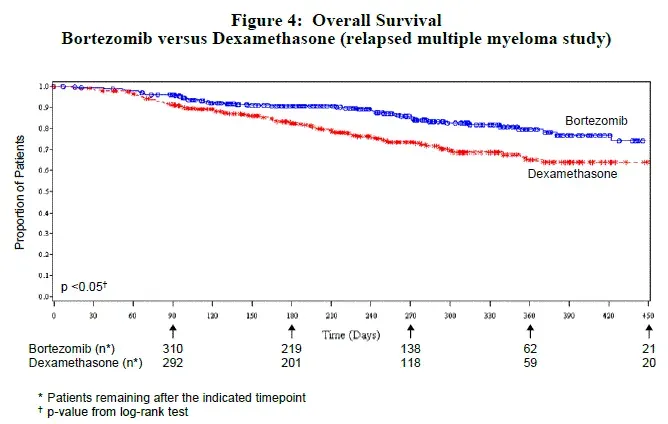 Studie neinferitu s otevřenou značkou (NCT00722566) porovnávala účinnost a bezpečnost subkutánního podávání Velcade vs. intravenózní podání. Tato studie zahrnovala 222 pacientů s bortezomibem na ¯ve s relapsovaným mnohočetným myelomem, kteří byli randomizováni v poměru 2: 1 a získali 1,3 mg/m² Velcade buď subkutánní (n = 148) nebo intravenózní (n = 74) trasou pro osm cyklů. Pacienti, kteří nezískali optimální odpověď (méně než úplná odpověď (CR)) na terapii samotnou Velcade po čtyřech cyklech, bylo dovoleno dostávat perorální dexamethason 20 mg denně v den a po podání Velcade (82 pacientů v subkutánní léčebné skupině a 39 pacientů ve skupině intravenózní léčby). Pacienti s výchozím stupněm ≥ 2 periferní neuropatie nebo neuropatickou bolestí nebo počtem destiček <50000/μL were excluded. A total of 218 patients were evaluable for response.